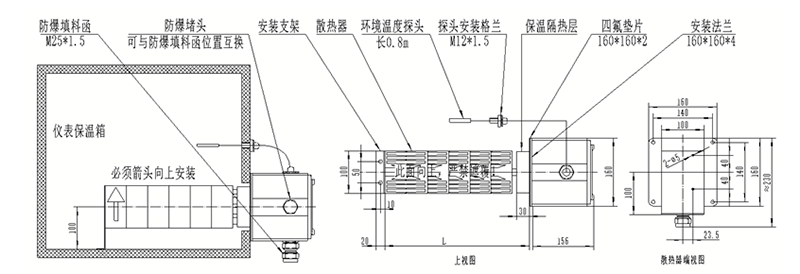 3)加热部分在箱内,能承受较高温度;接线盒不能承受高温,必须在箱外。加热部分和接线盒不能被分拆,须在箱体上开孔,将加热部分插入箱内,和箱体间用自带法兰和垫片密封安装。